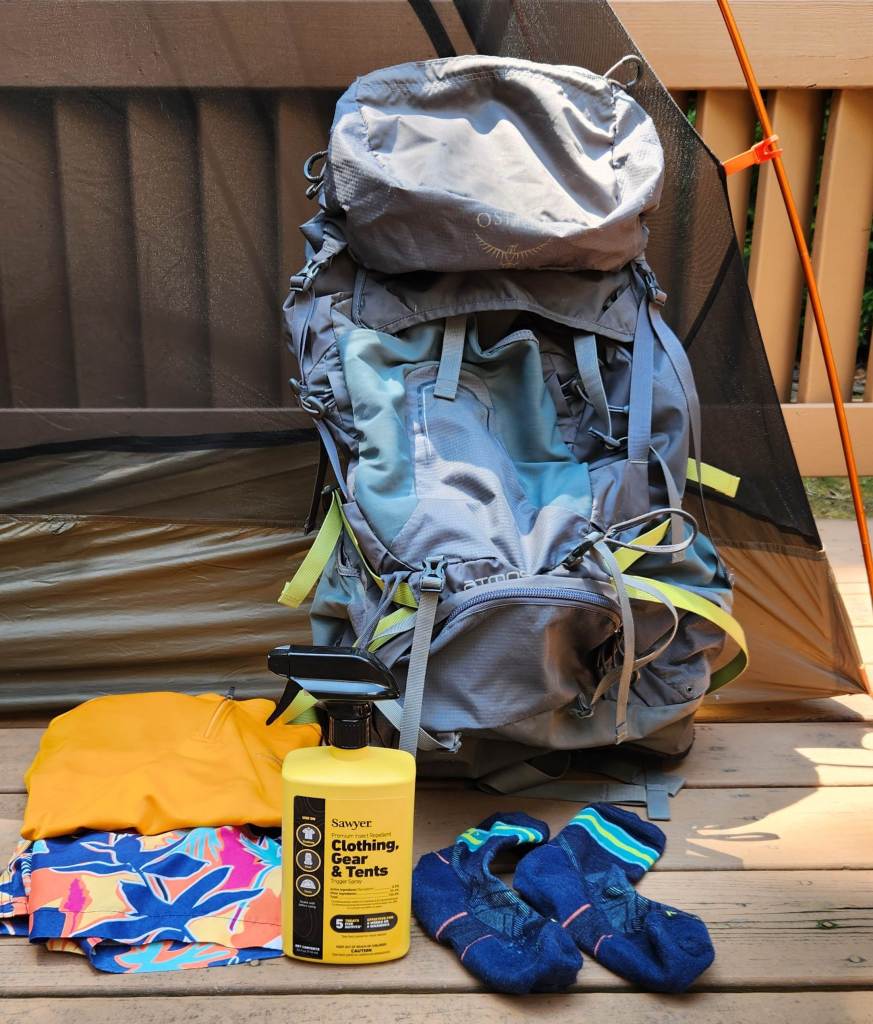 Permethrin treatment for gear and clothes is recognized as the standard for tick prevention. Factory-treated items generally maintain their effectiveness for 60 washings, and home-treatments from Sawyer are effective for 6 weeks or 6 washings. Sawyer says their permethrin can be used on dogs but is toxic around cats until it has dried. Many Appalachian Trail hikers can share success stories about permethrin, and my experience was that I only saw one tick on myself over 2000 miles, and it was dead on my permethrin-treated sock. In addition to my clothes, I always treat my backpack, paying special attention to the straps, and I treat my Nemo Switchback pad, because I carry it outside of my pack. I also treat my tent sometimes.