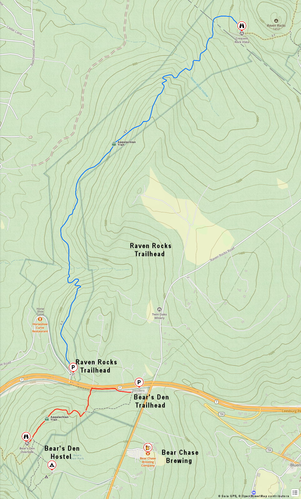 The Raven Rocks and Bear’s Den trailheads at Snickers Gap are located about 40 minutes west of Reston/ Herndon, Virginia on Highway 7 and offer the closest Appalachian Trail access to these towns. There are no fees to use either the smaller Raven Rocks lot on the north side of Highway 7 or the larger Bear’s Den lot on the south side. Cell phone service is generally good because of the elevation of the area.