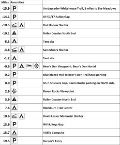 Any AT trailhead will offer virtually unlimited backpacking opportunities, and Raven Rocks/ Bear’s Den is no exception. Rather than repeating the details from a previous post about a trip from Sky Meadows to Harper’s Ferry that passes through here, I’ve made the table below that outlines nearby access points, designated campsites, and shelters. You can customize a trip that best suits you—whether it’s an out-and-back overnight with one car, a point-to-point with two cars, or any other option you prefer.