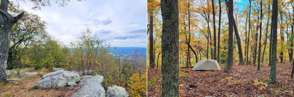Day 2: 6.5 Miles. Descend the Massanutten Trail to Little Passage Creek to fill up on water for tonight’s dry site near the intersection of the Mine Gap and Massanutten Trails. After Little Passage Creek, you’ll ascend the Tuscarora-Doll Ridge Trail and walk 3 miles along a very rocky ridge to the intersection with with Massanutten Trail, arriving at the spacious campsite (above right) shortly after the intersection with the Mine Gap Trail.