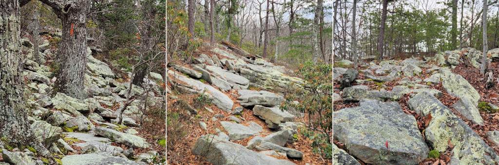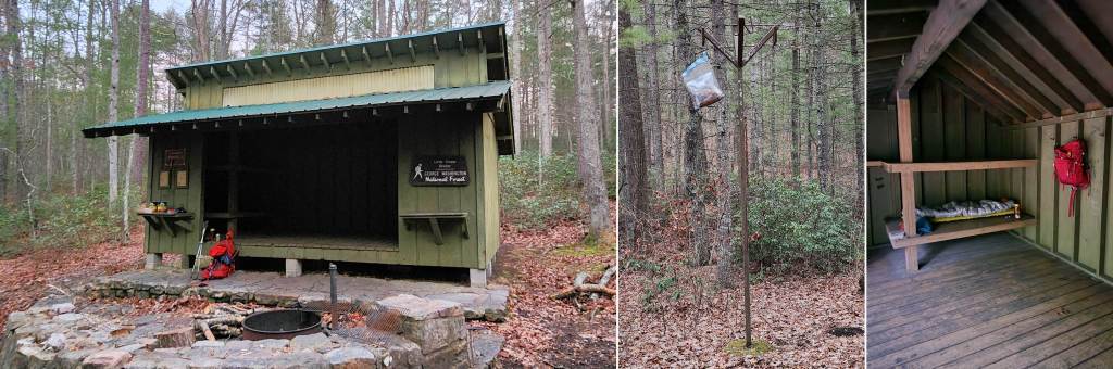 This well-maintained three-sided Appalachian Trail style shelter offers protection from bad weather. There are 4 elevated bunks, with additional space on the floor, but camping is prohibited in the vicinity. Usage is generally light, and I had it to myself on a cold weeknight in December. Spring weekends might be a different story. Water is available, but it must be treated. There is also a privy and a fire ring. You can leave your bear canister at home, because a bear pole protects your food from most animals (and vice versa). I put my food in a wire mesh Outsak storage bag, and I’ll have to make a post about flying squirrels some day.