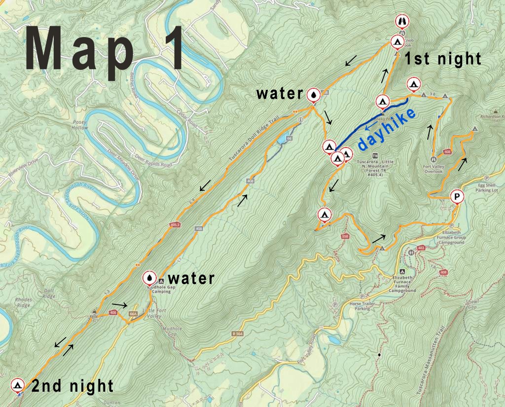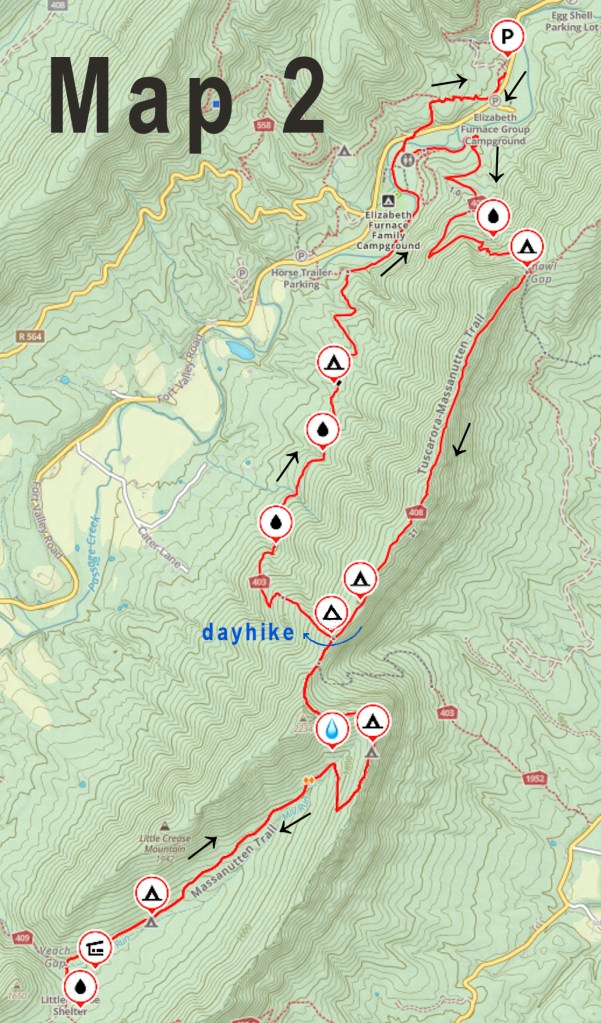 If you’re willing to forgo the amenities at Little Crease Shelter, there are many trip options from one night to a week on the Massanutten Trail. Here’s a two-night trip that I enjoyed and is perfect for a weekend. It is shown on Map 1 above.