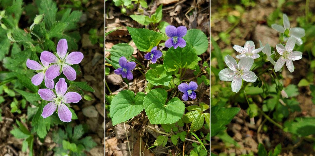 The scenery is pleasant, and with no dramatic vistas, your eyes may be drawn closer to the path, where the wildflowers were varied and abundant. I saw the wild geraniums, violets, and Virginia spring beauties shown below, along with many others. I was serenaded by countless birds and saw a few six-spotted tiger beetles—you might remember those from Good Wolf Gear’s spring naturalist program. Bear do exist in the area, and I talked to one hiker who was being extra quiet because she hoped to see one.