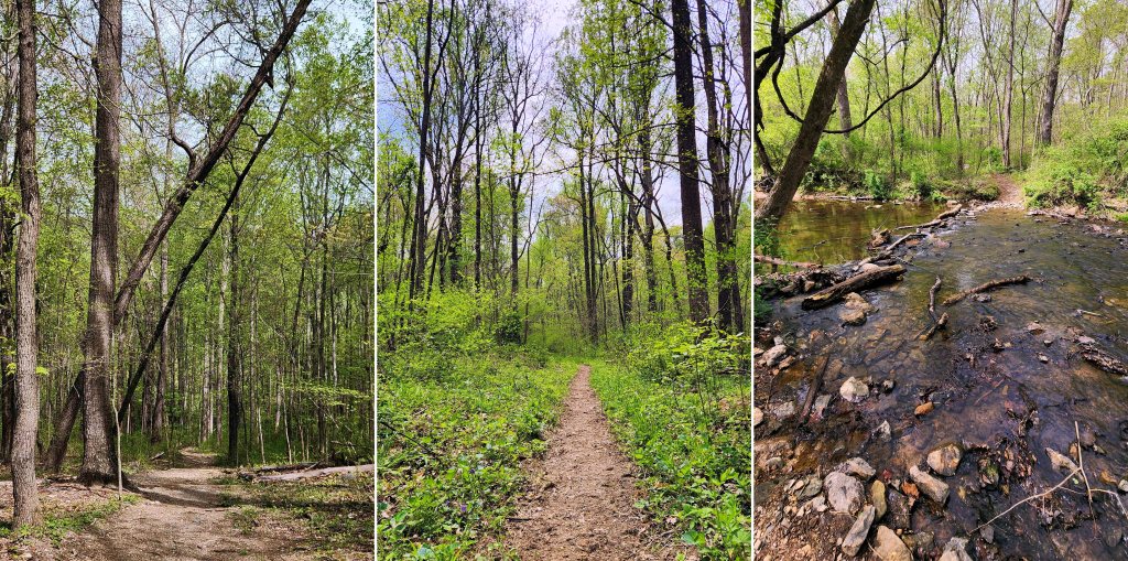 Definitely download the trail map or pick up a paper copy – because you will likely need it. The park’s 11-mile network of trails has many intersections, and I often had to refer to the map, even though most intersections are well-marked. Instead of recommending a specific route, I’d say just grab your map, go explore the park, and see what you find. You really can’t go wrong because the trails are mostly smooth, wide, and easy to follow, and they are well-maintained by hard-working volunteers from the Potomac Appalachian Trail Club. Even the single-track trails are pretty smooth, and I would love to go for a run there. Nearly all trails are open to equestrian users, and I saw two people on horseback when I visited on an April Thursday. For safety, remember that hikers should always yield to horses. (Those of us with equinophobia like to joke that horses are just as scared of us as we are of them!) The trails cross Sweet Run and Piney Run several times, and not all crossing have bridges. I rock-hopped across Piney Run at the crossing shown below, but I did have to turn around at another crossing to keep my feet dry.