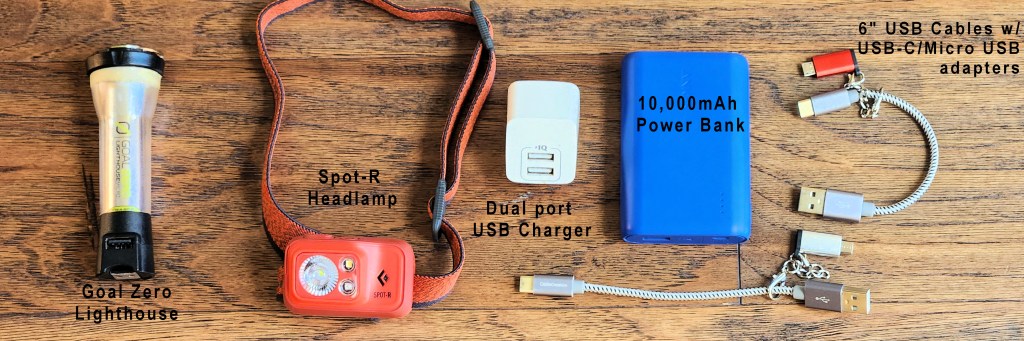 I carry a 10,000mAh power bank on one-week trips, and I love my 6-inch USB cables with USB-C/ Micro USB adapters for charging my phone or my Garmin InReach Mini. I always bring two cables for redundancy—especially after carelessly breaking one on a previous trip. If I expect to find a power outlet, I’ll also carry a 2-port USB charger.