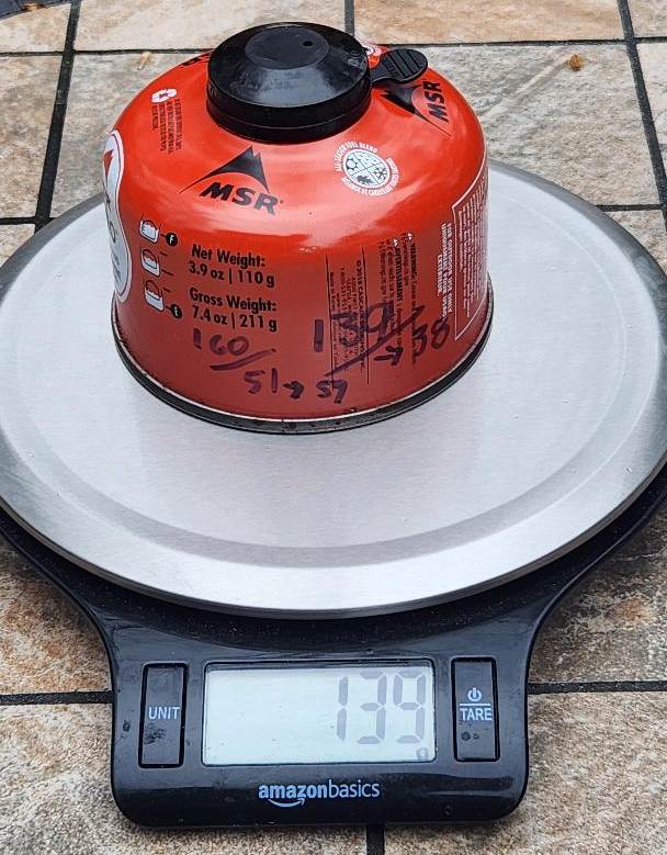 3. Divide the fuel consumed by the number of nights to get the average per night. In my case, 51g over 6 nights gives me 8.5 grams per night. I used the canister again on a 2-night trip in freezing weather and consumed 21g, or 10.5g per night. The higher consumption on the second trip makes sense because of the colder weather and more usage. That left me with 38g, as I noted on the canister.